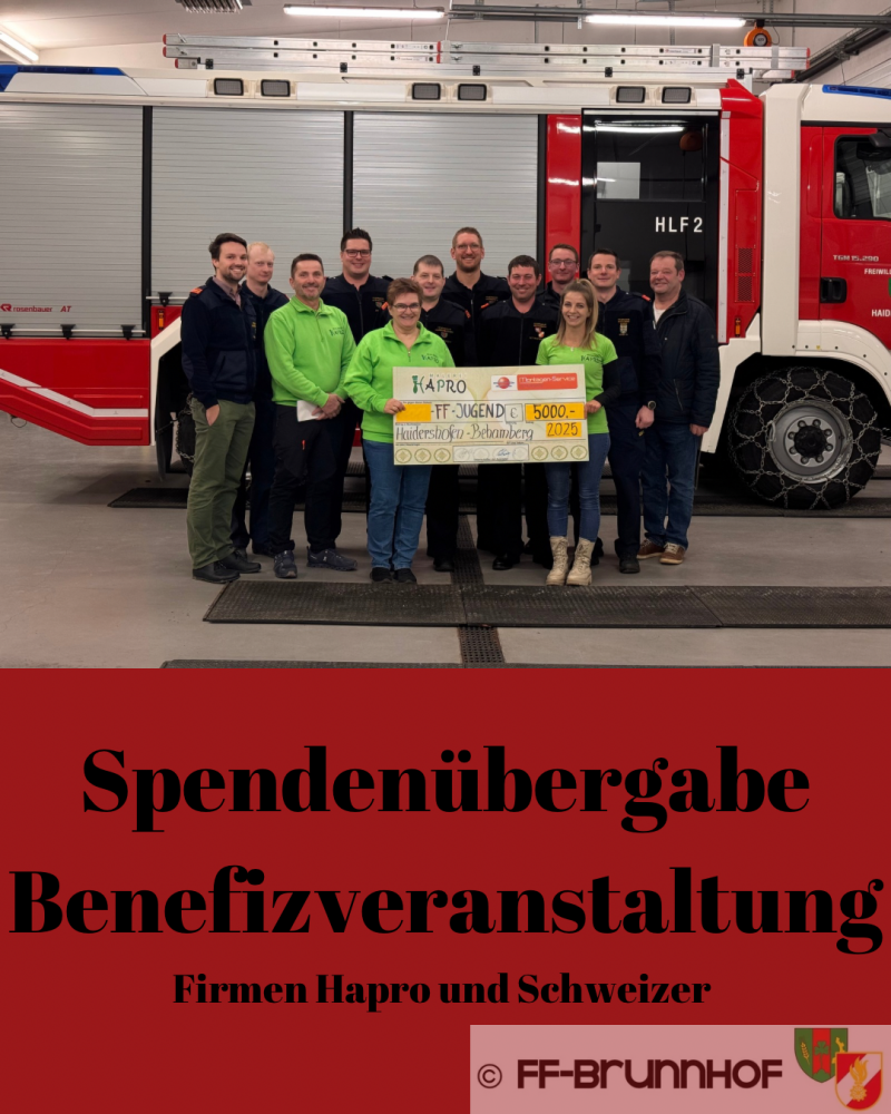 Die Freiwillige Feuerwehr Brunnhof freut sich gemeinsam mit den Feuerwehren Vestenthal, Haidershofen, Behamberg und Wachtberg über eine großzügige Spende in Höhe von 5.000 Euro. Diese Summe wurde von den Firmen Hapro und Schweizer bei ihrer jährliche Benefizveranstaltung gesammelt und nun an die Feuerwehren übergeben.